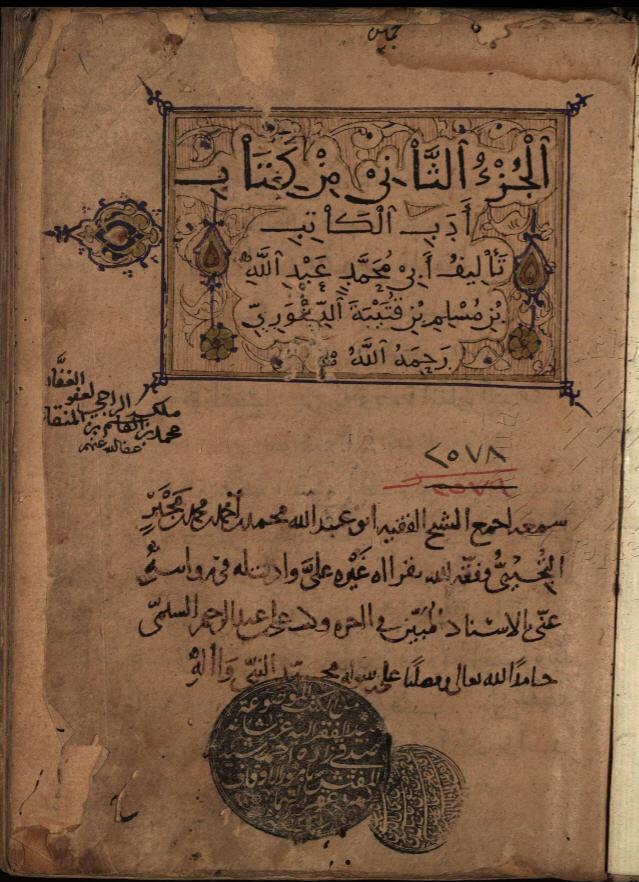 أدب الكاتب لأبي محمد: عبد الله بن مسلم، المعروف: بابن قتيبة النحوي. المتوفى: 270 سبعين ومائتين. (276) . قيل: هو خطبة بلا كتاب، لطول خطبته، مع أنه قد حوى من كل شيء. أوله: (أما بعد حمدا لله بجميع محامده ... الخ) .
