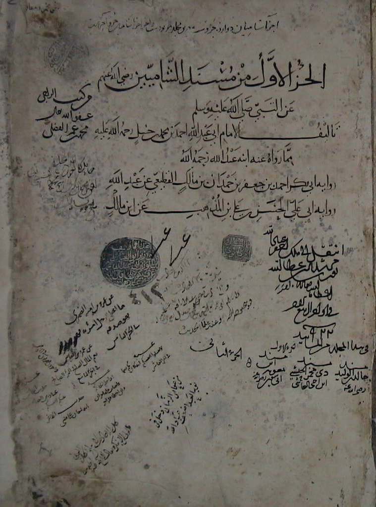 المتوفَّى: سنة 241، إحدى وأربعين ومائتين. يشتمل على: ثلاثين ألف حديث. في: أربعة وعشرين مجلدا. تسعة عشر مجلدا: من نسخة الوقف، بالمستنصرية. وهو: كتاب جليل، من جملة أصول الإسلام. وقد وقع له فيه: نيف عن ثلاثمائة حديث، ثلاثية الإسناد. ذكر أن: أحمد بن حنبل، شرط فيه ألا يخرج إلا حديثا صحيحا عنده. قاله أبو موسى المديني. وأجيب: بأن فيه أحاديث موضوعة. وقد ضعف الإمام نفسه. ذكره البقاعي.